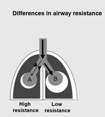 The left side shows a lung where airway resistance is greater in one side (A) than in another. Narrowing of airway occurs, for instance, in chronic bronchitis in which there is increased mucus secretion and swelling of the bronchial mucosa. The severity of these changes may vary throughout the lung. In this case, the airflow in and out of A will be lower than in B, and VA will be lower in A.