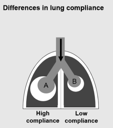 If there are areas with different compliance (right side), the change in volume induced by a given increase in PTP will be lower in B (low compliance, stiff lungs) than in A, and VA will be lower in B