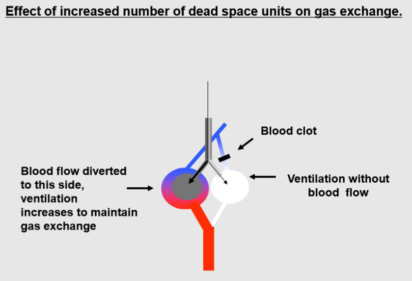 The effect of this condition on arterial blood gases depends on whether the remainder of the lung is able to maintain a level of ventilation that will adequately oxygenate the blood and eliminate CO2; this, in turn, depends on the size if the unperfused area, and on the overall condition of the lung; this could occur in a healthy person with normal lungs (blood clot in a pregnant woman with varicose veins) or in a person with lung disease. When VD/VT is >0.6, patients are usually ventilated artificially because they can not maintain adequate ventilation.