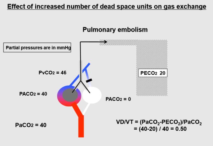 Ventilation perfusion units with a high VA/Q ratio behave as an extension of the anatomic dead space. An extreme example is occlusion of a pulmonary artery branch (pulmonary embolism). This could happen when a blood clot in the venous side of the circulation dislodges and is carried by the blood to the lungs. The air ventilating the affected area does not loose O2 or gain CO2 because there is no blood flow with which gases can be exchanged. Cardiac output will be redirected to the open vessels. Ventilation to the perfused areas of the lung will increase, and, depending on the extent of the occlusion, blood may be relatively well oxygenated. The air coming from the non-perfused zone contains no CO2, and, when mixed with the air coming from the perfused area, will “dilute” the CO2 in the mixed expired air. The value of arterial PCO2 will reflect the PCO2 of the alveoli that receive blood (and CO2); accordingly, PECO2 will decrease, the difference between PaCO2 and PECO2 will increase, and the calculated VD/VE will increase.