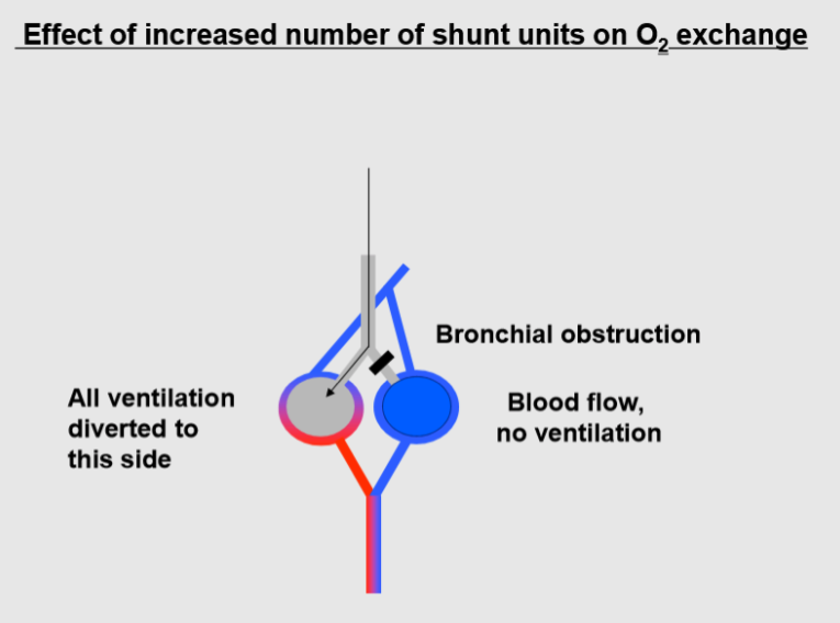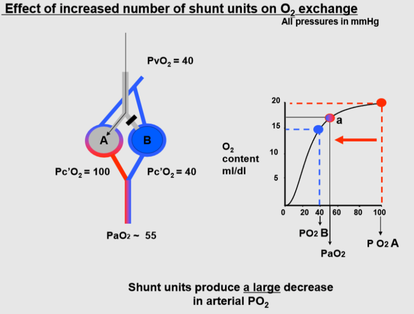 Shunt units behave as veno-arterial shunts, i.e. as a stream of venous blood that bypasses the ventilated area of the lung and does not change PO2 or PCO2. An extreme example is bronchial occlusion, where blood draining from the non-ventilated area does not undergo gas exchange and maintains the same composition of venous blood. When both blood streams mix in the left atrium, the result will be a lower PO2 and a higher PCO2 than those of the blood draining the well ventilated area. However, due to the difference in the shapes of the ODC and the CO2 dissociation curve, PO2 will be much more affected than PCO2.