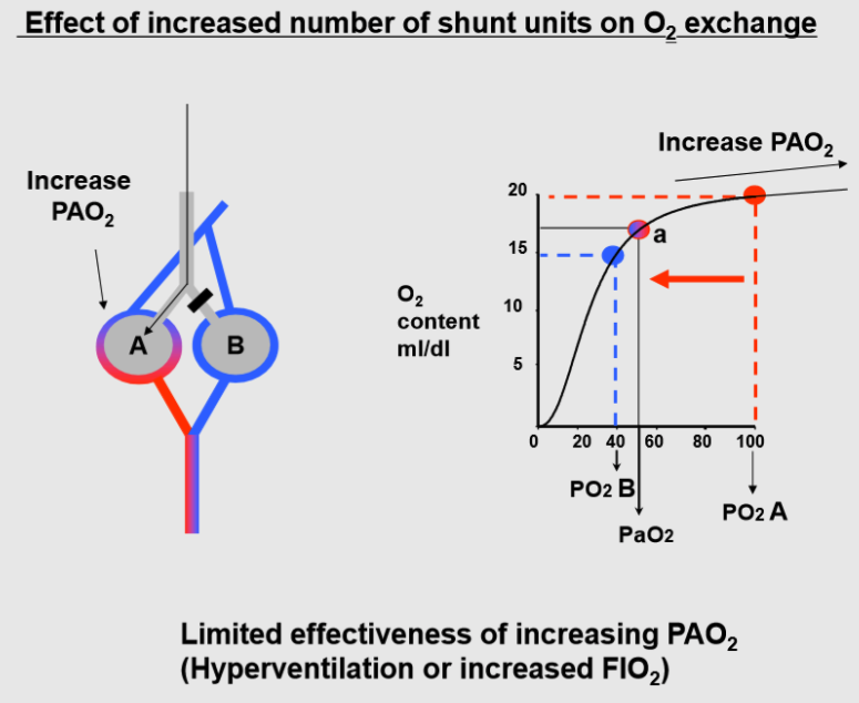 The blood flowing through A has a high O2 saturation, so increasing PAO2 (i.e. hyperventilation or increasing inspired O2) does not increase the blood O2 content by much. The increased PAO2 does not affect the blood flowing through B, since the area has no ventilation; accordingly the increase in PO2 of the blood leaving the lungs is relatively small. The lack of significant effect of increasing PIO2 on PaO2 is a hallmark of these type of conditions.