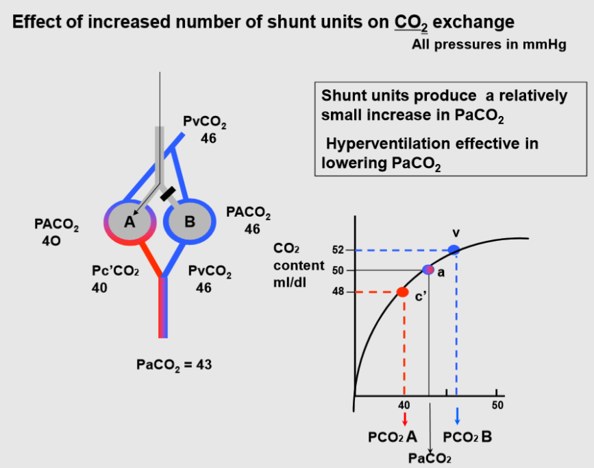 Besides decreasing PaO2, shunts tend to increase PaCO2. However, the effect on PaCO2 is much smaller than the effect on PaO2.