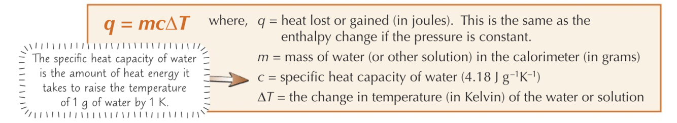 State what equation (& the units) you can use to calculate the enthaply change in calorimetry