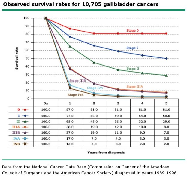 In another Japanese series of 1686 resected gallbladder cancers from 172 major hospitals, survival rates were significantly better for patients undergoing radical resection compared with patients with simple cholecystectomy (three-year survival: 66% vs 14%, 5-year survival: 51% vs 6%).