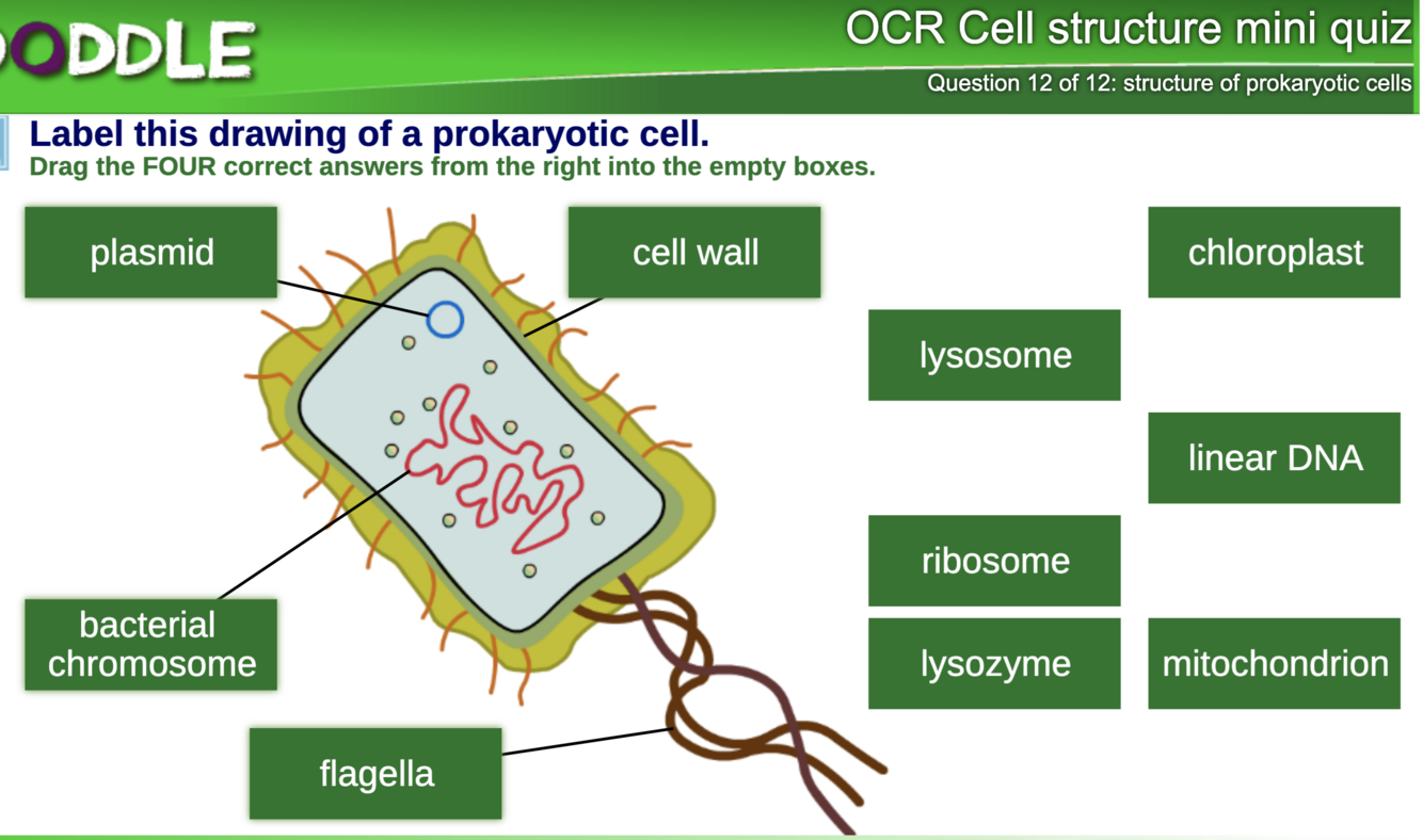 Prokaryotic = no membrane bound organelles, no nucleus, smaller ribosomes, murein cell wall