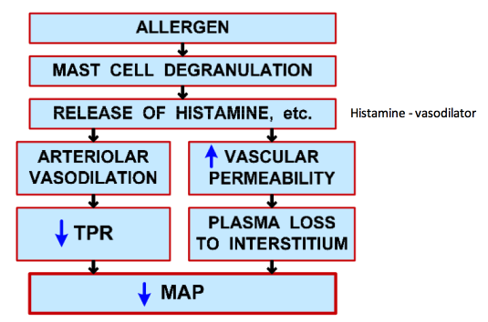 Describe the mechanism leading to decreased MAP in anaphylactic shock.