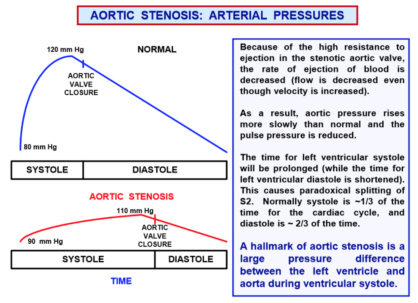 Aortic pressure rises more slowly than normal and pulse pressure will be reduced. The time for left ventricular systole will be prolonged.