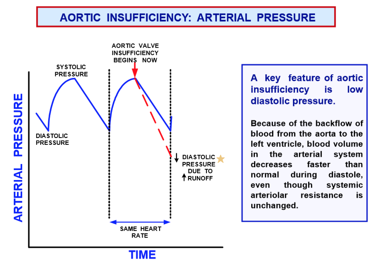 This is because of back flow of blood from the aorta to LV, blood volume in the arterial system decreases faster than normal during diastole, even though systemic arteriolar resistance is unchanged.