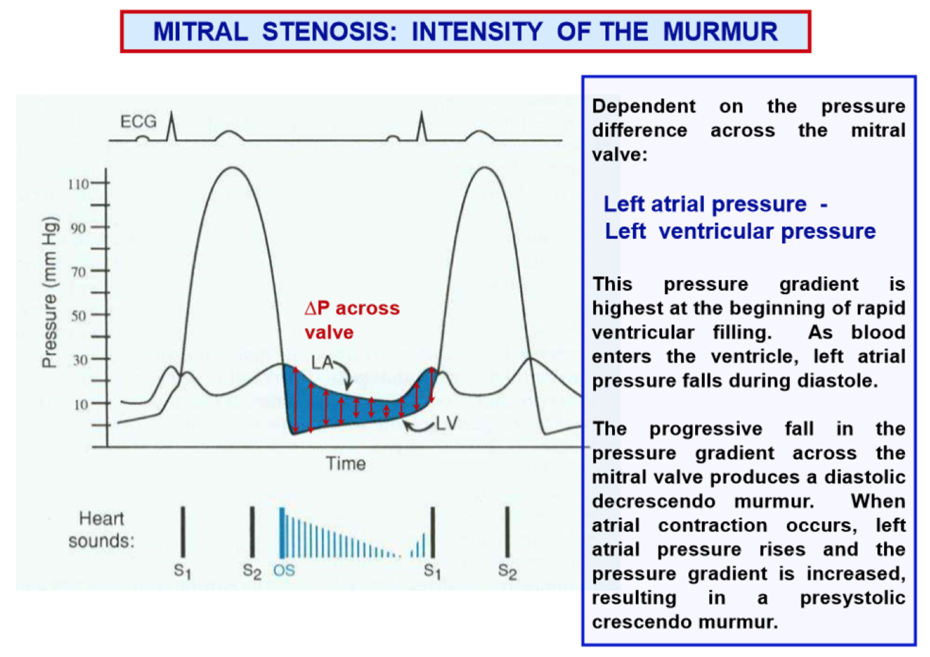 The pressure gradient is highest across the valve at the beginning of rapid ventricular filling. As blood enters, left atrial pressure falls during diastole. Artial contraction causes the second part of the murmur.
