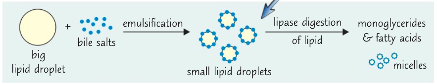 Monoglycerides and fatty acids stick with bile salts to form tiny structures called micelles