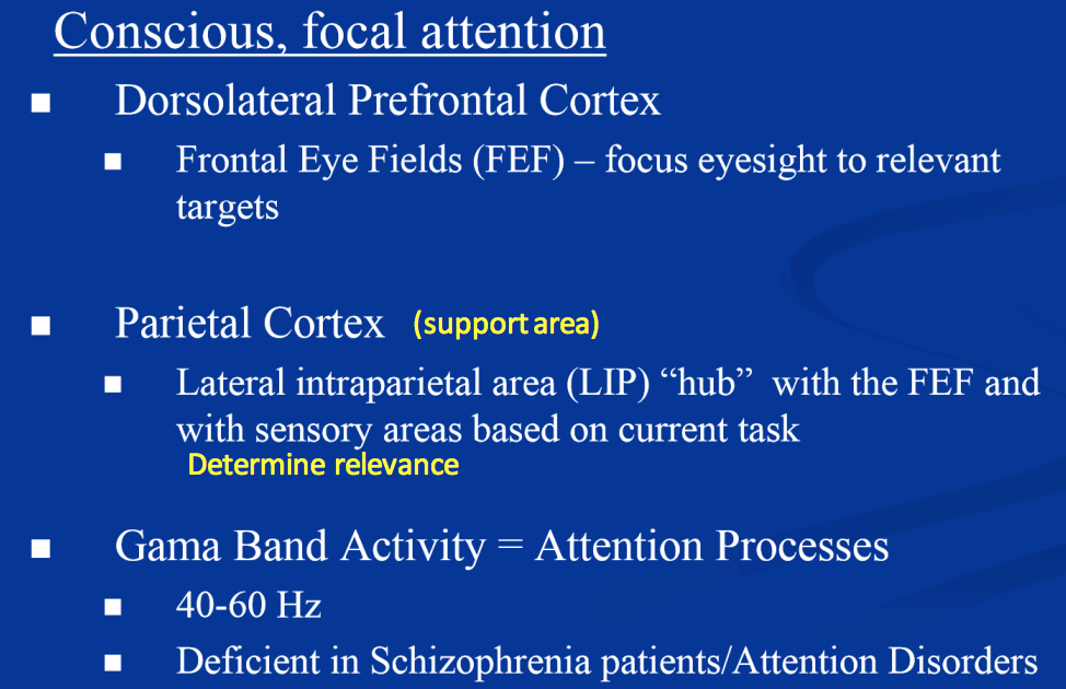 What areas of the brain are involved in conscious, focal attention?