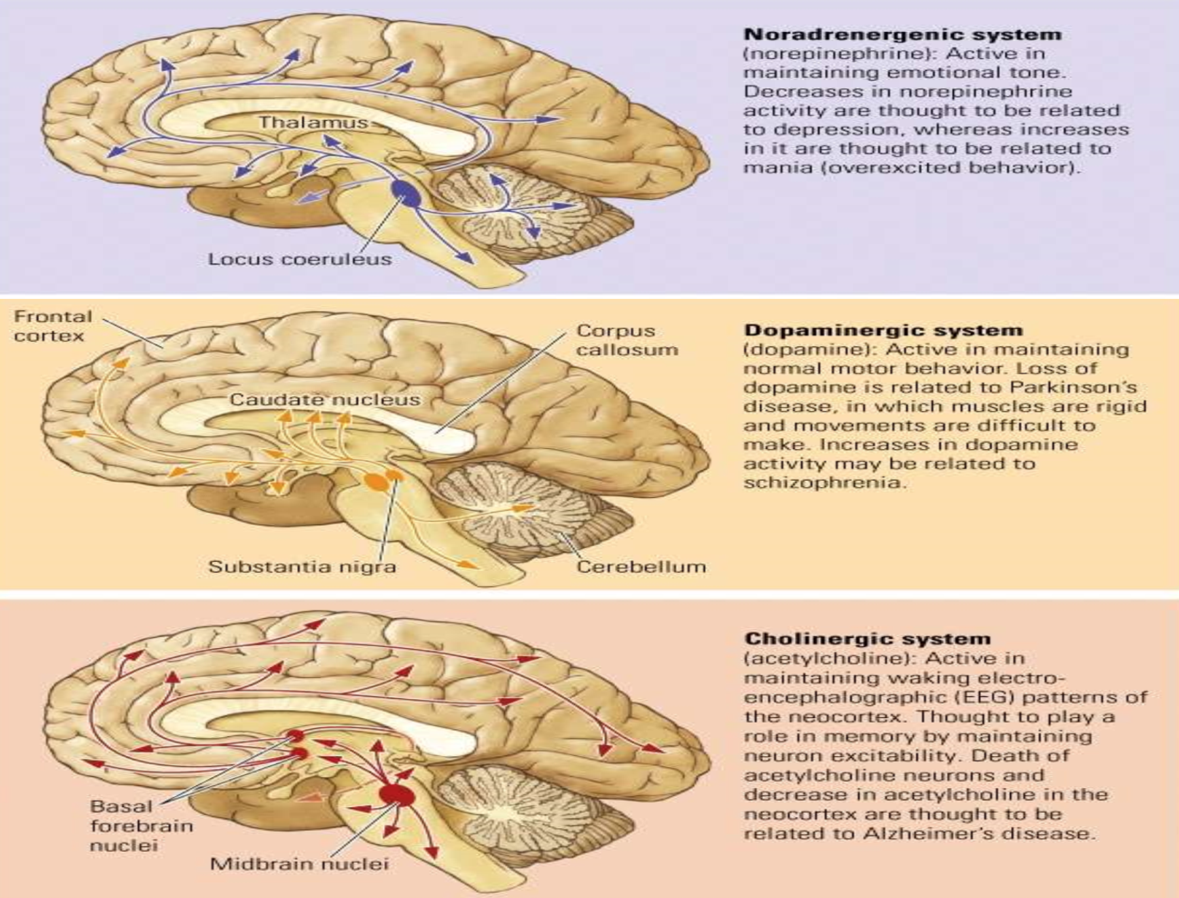 Describe the 3 NT systems at play in the brain