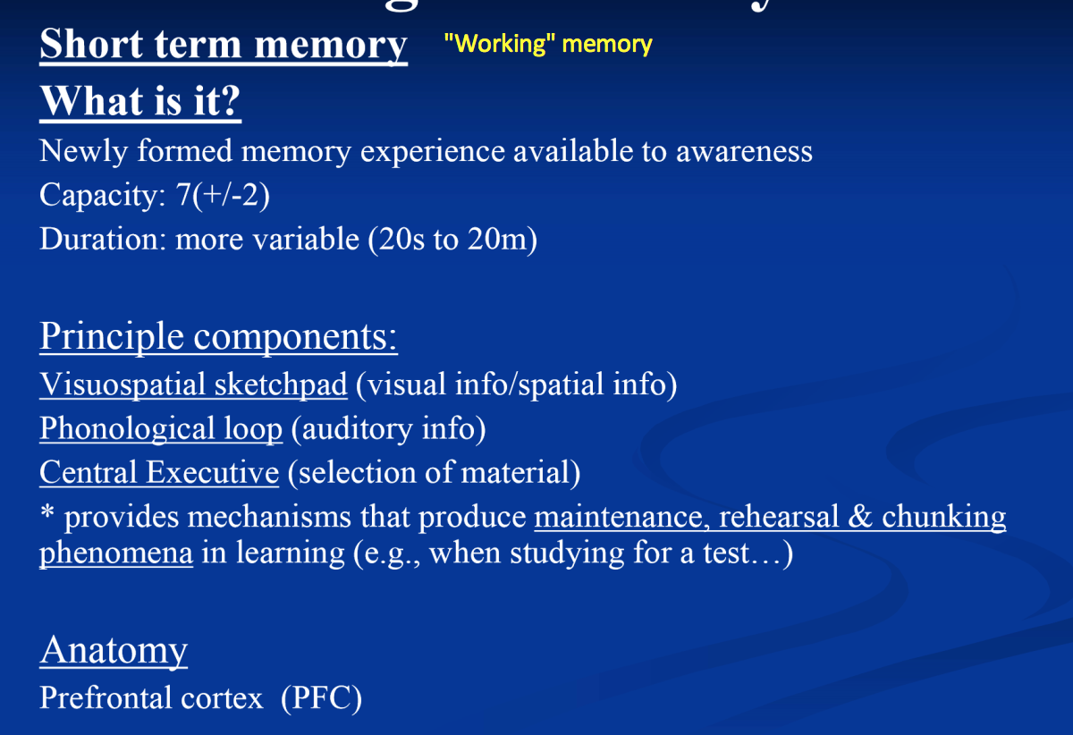 What is short term/working memory? Capacity? Duration? Principle components? Anatomy?