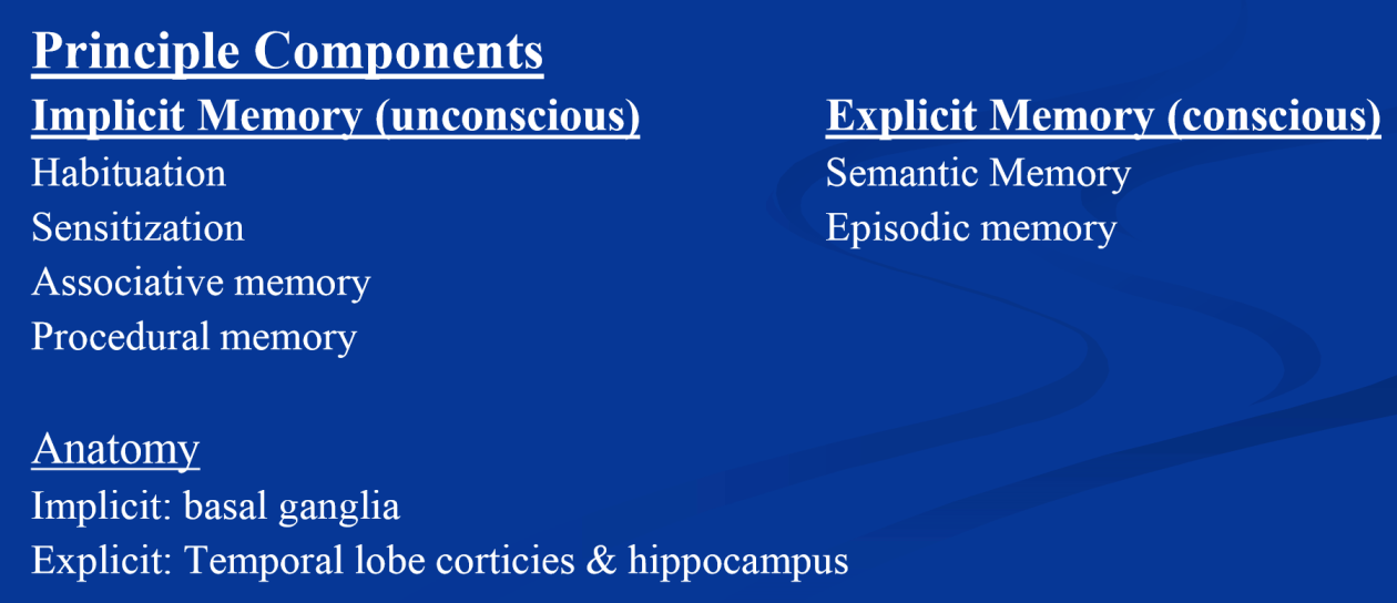 What are the two principle components of long term memory? What anatomy is associated with these two principle components?