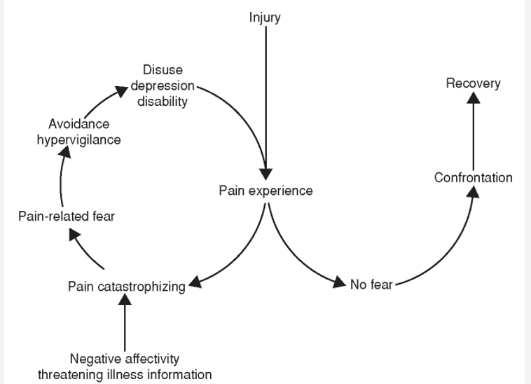 Fear avoidance belief leads to kinesiophobia; a way to reduce this is to educate patients about the neurophysiology of pain