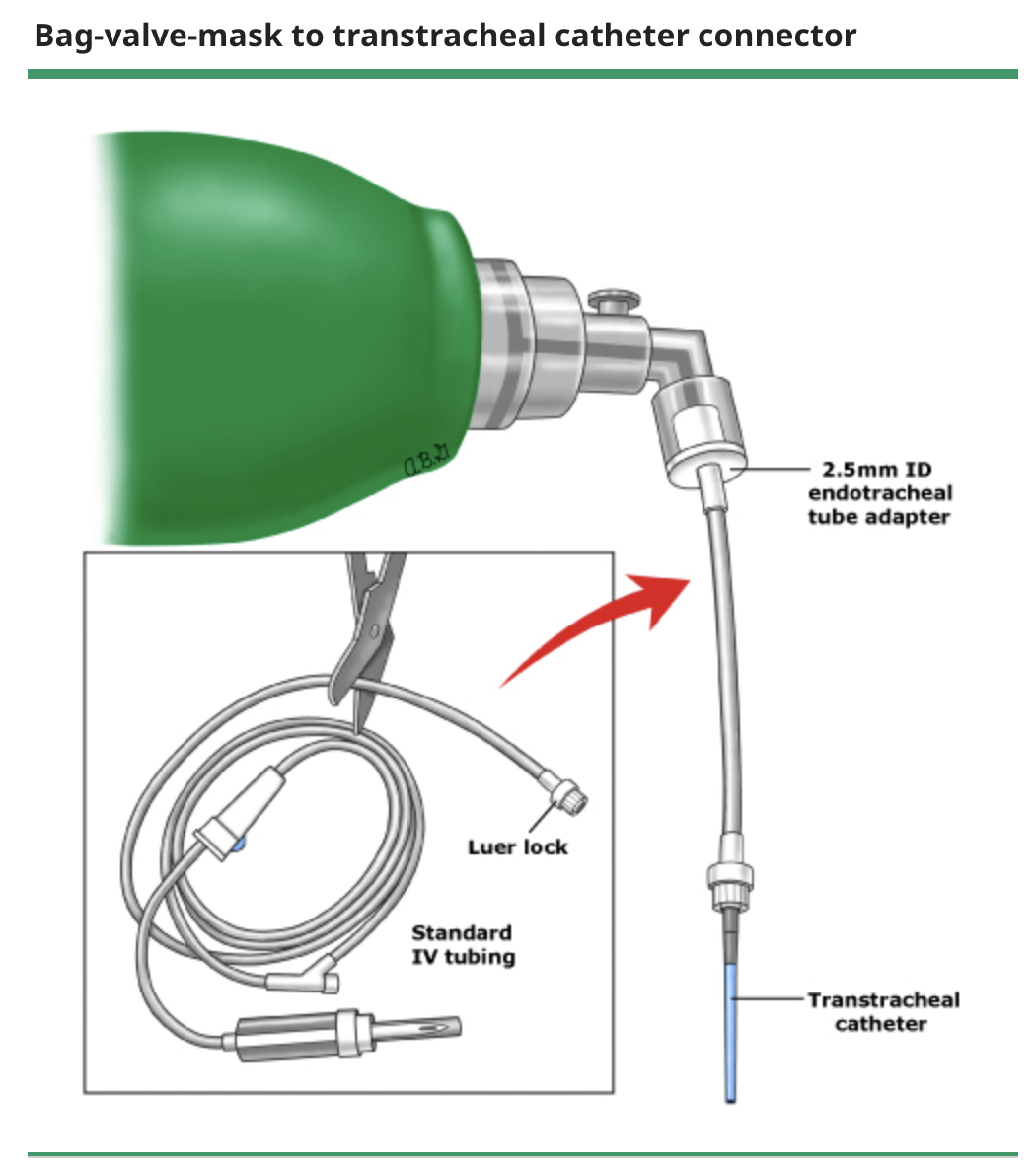 e) Pour ventiler: connecter l’aiguille à un connecteur d’un tube endotrach 3 mm puis ventiler à l’ambu en ratio: 1 seconde insufflation, 4 secondes d’expiration (vs ambu connecté à connecteur de tube endotrach 2,5 mm -> connecté à tubulure -> connecté à l’aiguille via le luer lock).