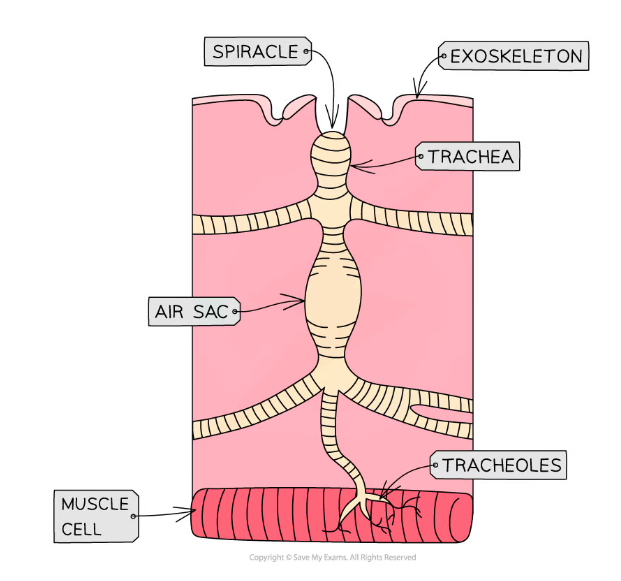 Insects have small openings in their exoskeletons called spiracles, small tubes called tracheae divide into even smaller tubes called tracheoles. The ends of the tracheoles are filled with liquid when the insect is at rest.