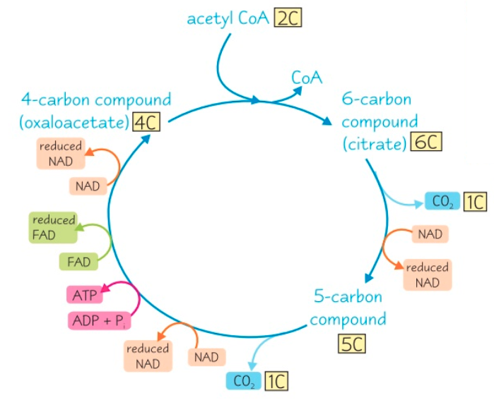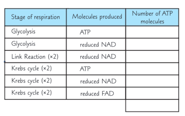 Krebs cycle happens once for every pyruvate molecule & goes round 2x for every glucose molecule