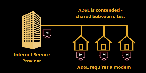 ADSL is contended which means that connection speeds are affected and slowed down with more systems that use the network at the systems