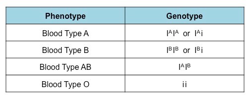 A allele = I^A ; B allele = I^B ; O allele = i (recessive)