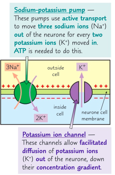1. Sodium-potassium pump uses active transport to move 3 Na+ out of neurone for every 2 K+ ions moved in