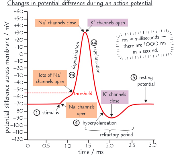 • Stimulus excites neurones cell membrane = Na+ channels to open, making membrane more permeable to Na+