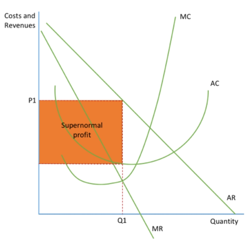 Draw a Cost, Revenue profit digram to show a monopolies supernormal profit.