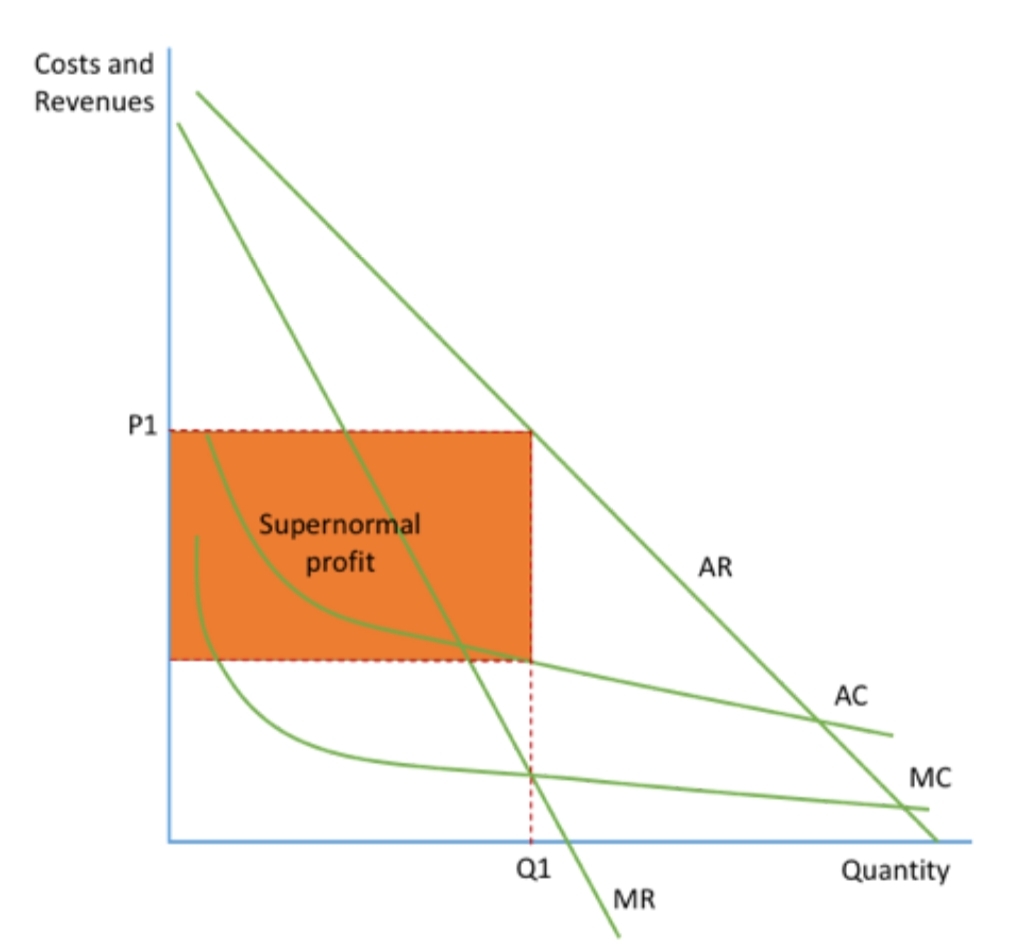 AC and MC continue to fall. The firm will profit maximise and produce where MC=MR at Q1P1, making supernormal profit of the shaded area.