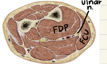 The other major site for ulnar damage is the medial epicondyle. Lesions there will affect both hand and forearm mm.