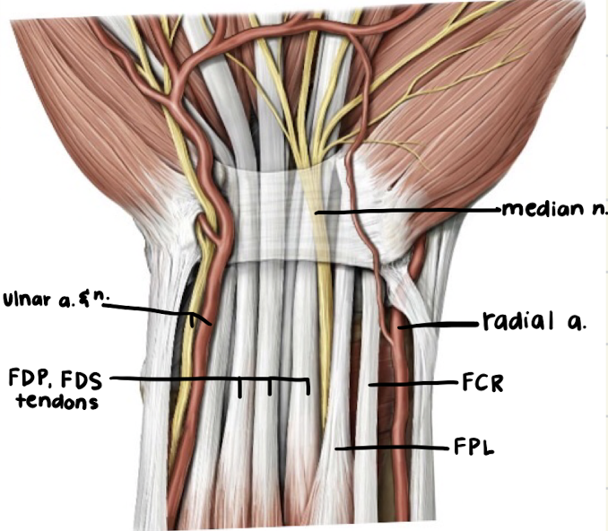FCP tendon passes lateral to carpal tunnel.