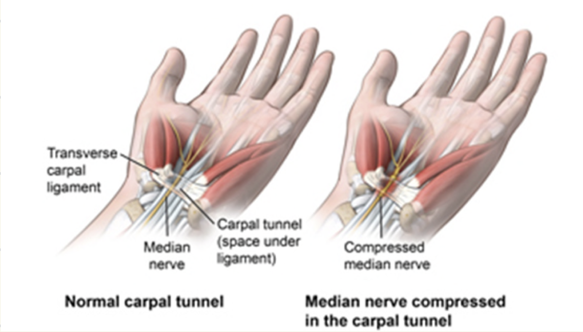 Compression of medial nerve as it passes through carpal tunnel