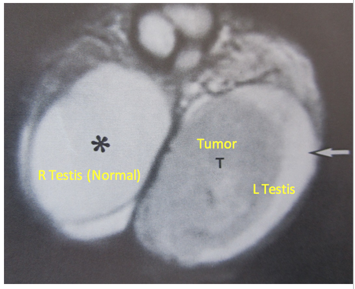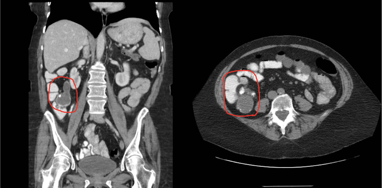 Cystadenocarcinoma (tissue density changes circled in red help in identification)