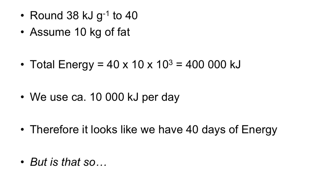 Triacylglycerol stores in adipose tissue is enough energy to survive at least ___ days of starvation