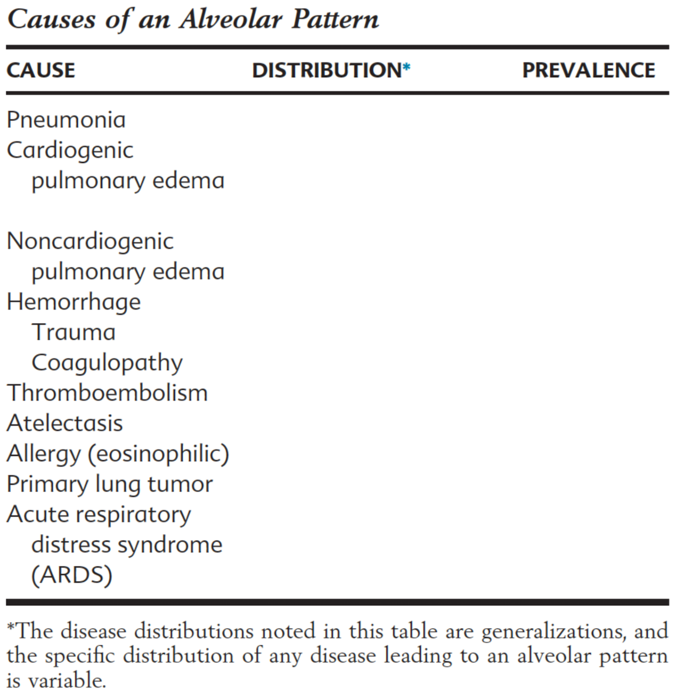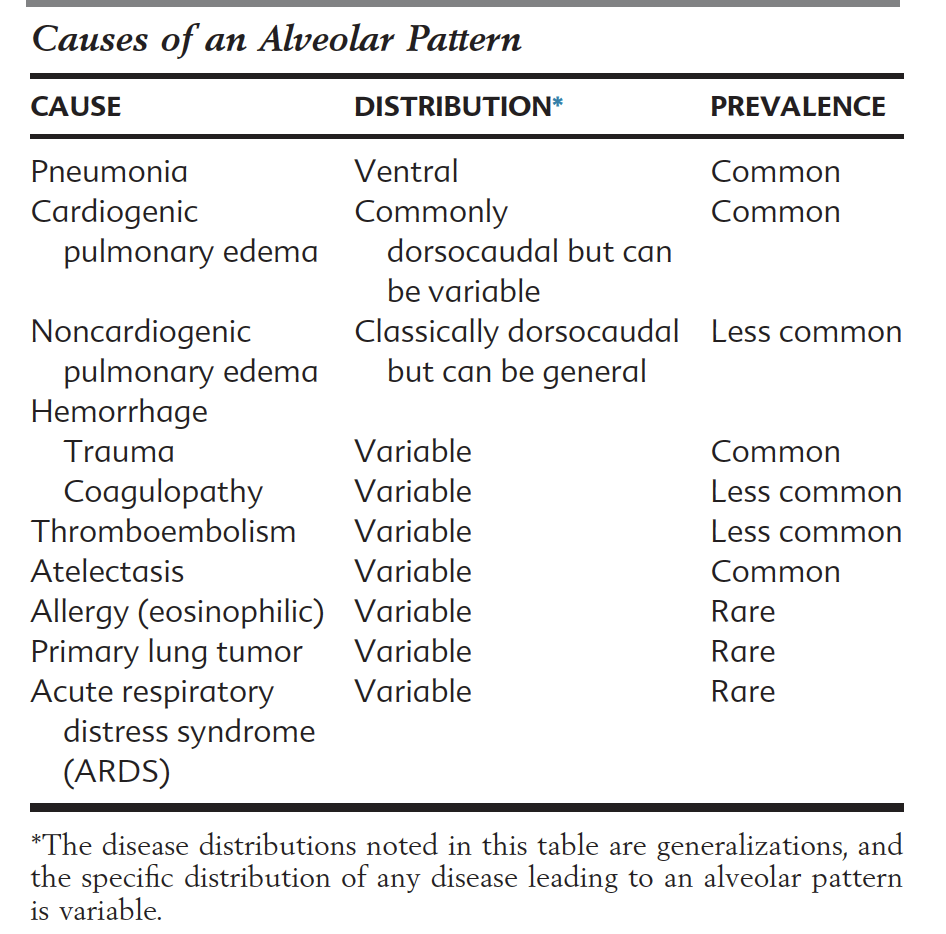 Detail 9 causes of an alveolar pattern (consider distribution and prevalence too..)