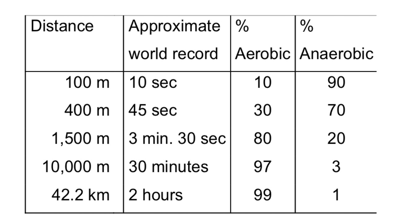 Approximate contribution of aerobic and anaerobic energy sources to total energy production in events of different durations involving maximal work
