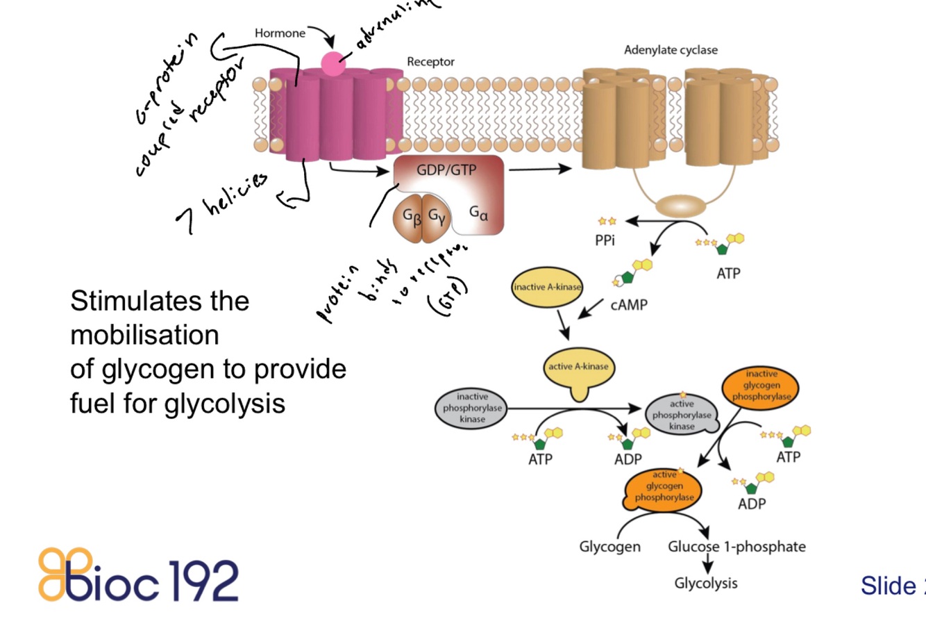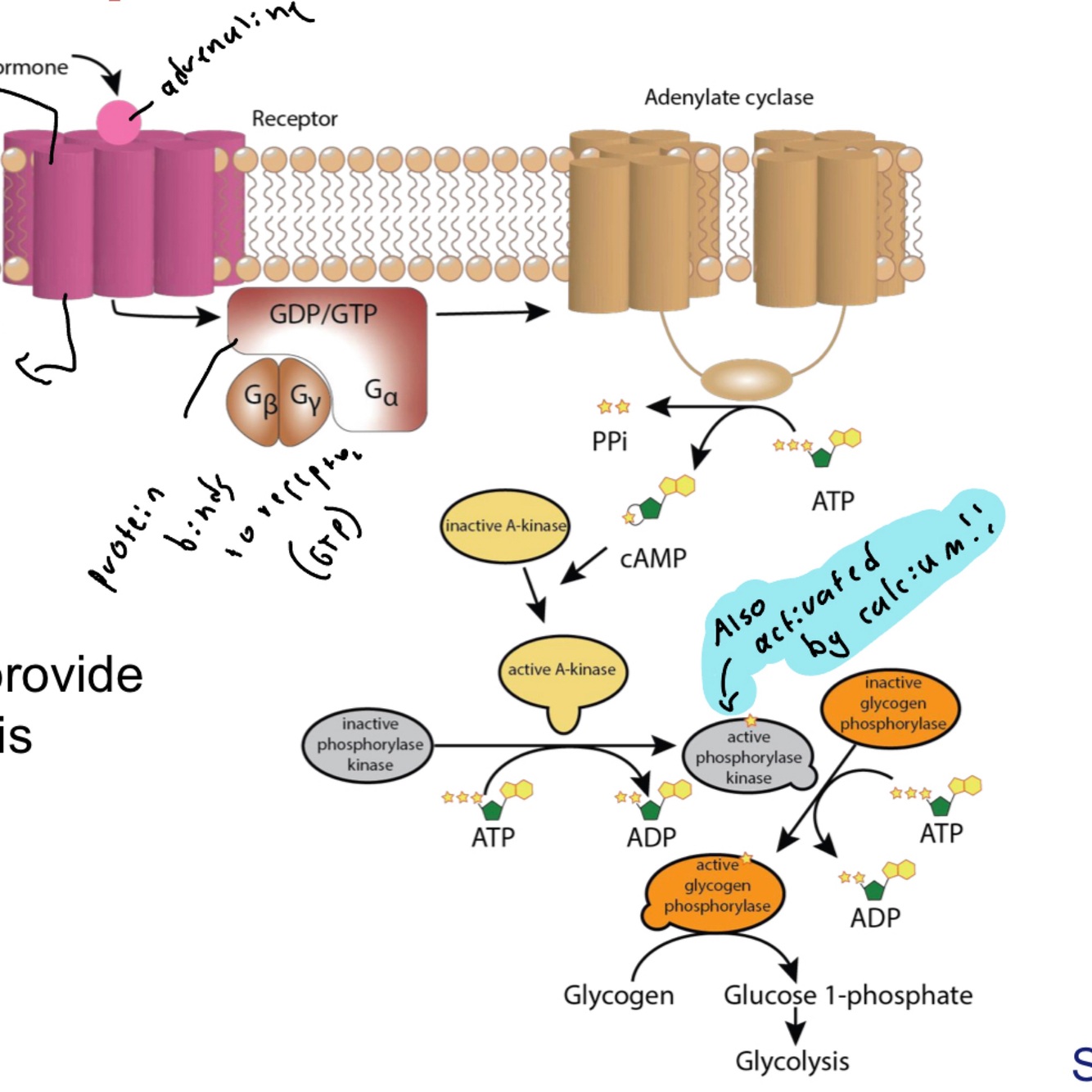 Adrenaline binds to beta adrenergic receptors on muscle cells which stimulates…