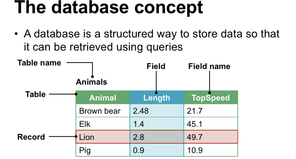 Record – an individual collection of data for one person/object, a row in a table