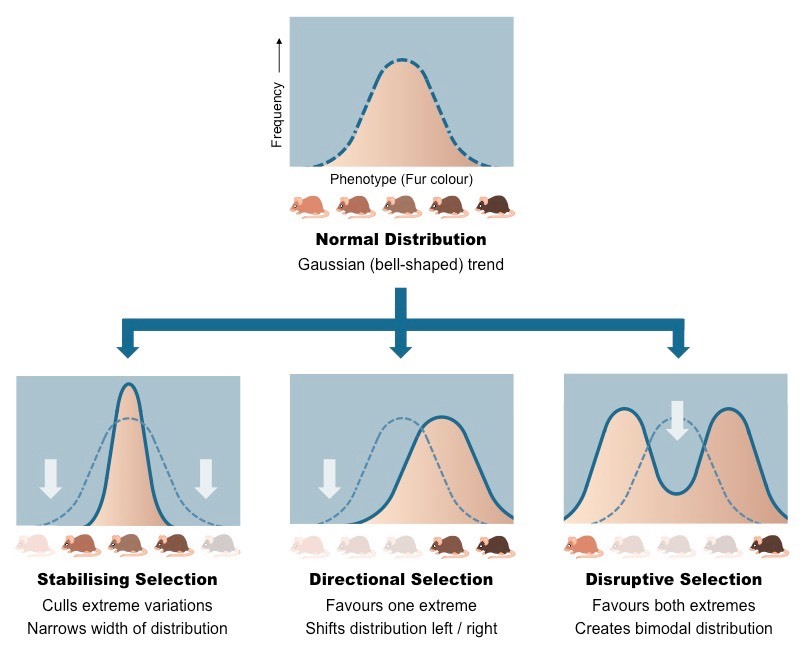 When individuals away from the mean are selected for. Individuals at both extremes are selected in favour of those near the mean so the normal distribution becomes ‘squashed’ in the middle