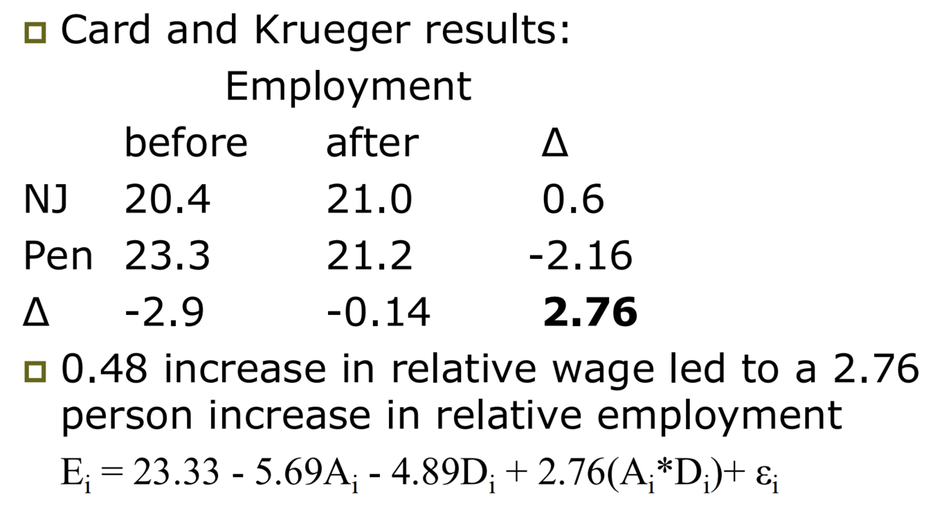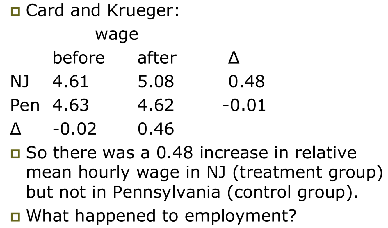 1992 -> minimum wage increased in New Jersey from $4.25 to $5.05 an hour. Left unchanged in neighbouring Pennsylvania.
