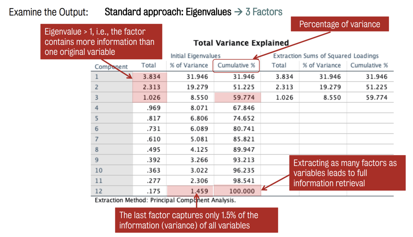 If your factors explain very little (e.g., 20–30%), you’ve reduced the data too aggressively and the factors may not represent the variables well.