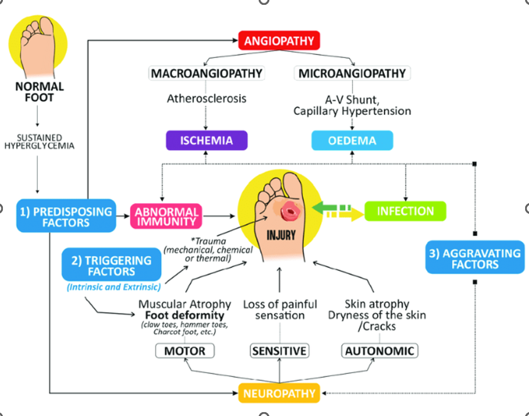 1- Hyper glycaemia –> Predisposing factor –> damage to vascular and nerve integrity
