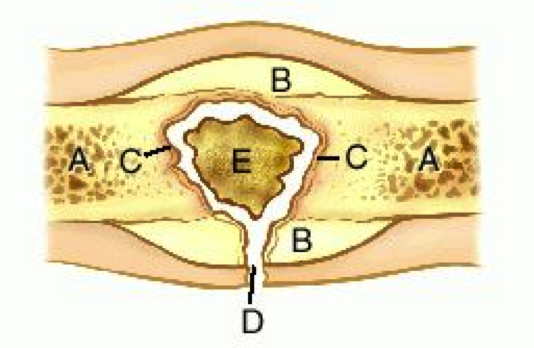Subperiostial abscesses form, and the periosteum deposits new bone (involucrum –C) around the sequestrum