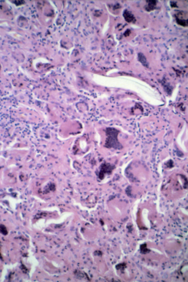 What is the most likely cause of the granuloma apparent in the section?