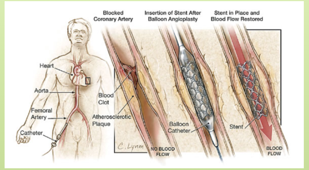 CORRECT – A percutaneous coronary intervention is a combination of coronary angioplasty with stenting. This procedure is commonly used to widen blocked or narrowed coronary arteries, such as in cases of MI. Using x-ray imaging to monitor the procedure, the cardiologist guides a thin wire from the incision site, through the arteries, and into the narrowed coronary artery. Once in position, a small balloon with a stent fitted over it is inflated and the stent is left inside the artery holding it open. This helps ensure blood flow to the heart tissue.