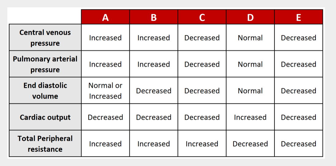 CORRECT – A corresponds to the changes that are seen in cardiogenic shock. Cardiogenic shock occurs when there is a failure in the pumping mechanism of the heart, leading to a fall in cardiac output. This means that the heart can fill as normal, however, it is unable to pump out the volume of blood required to maintain mean arterial blood pressure (maBP), leading to haemodynamic shock. As the blood pressure begins to fall, vascular smooth muscle cells vasoconstrict in order try to maintain maBP, leading to an increase in total peripheral resistance. The inability of the heart to pump blood leads to a backlog of blood in the pulmonary circulation (increasing pulmonary arterial pressure) and in the venous system (increasing central venous pressure). As the heart can fill as normal, the end diastolic volume remains normal in most cases, however, the accumulation of blood in the heart can also stretch the ventricles, meaning that there can actually be an increase in end diastolic volume in some cases. Causes of cardiogenic shock include serious arrhythmias, acute worsening of heart failure and severe myocardial infarctions of the left ventricle.
