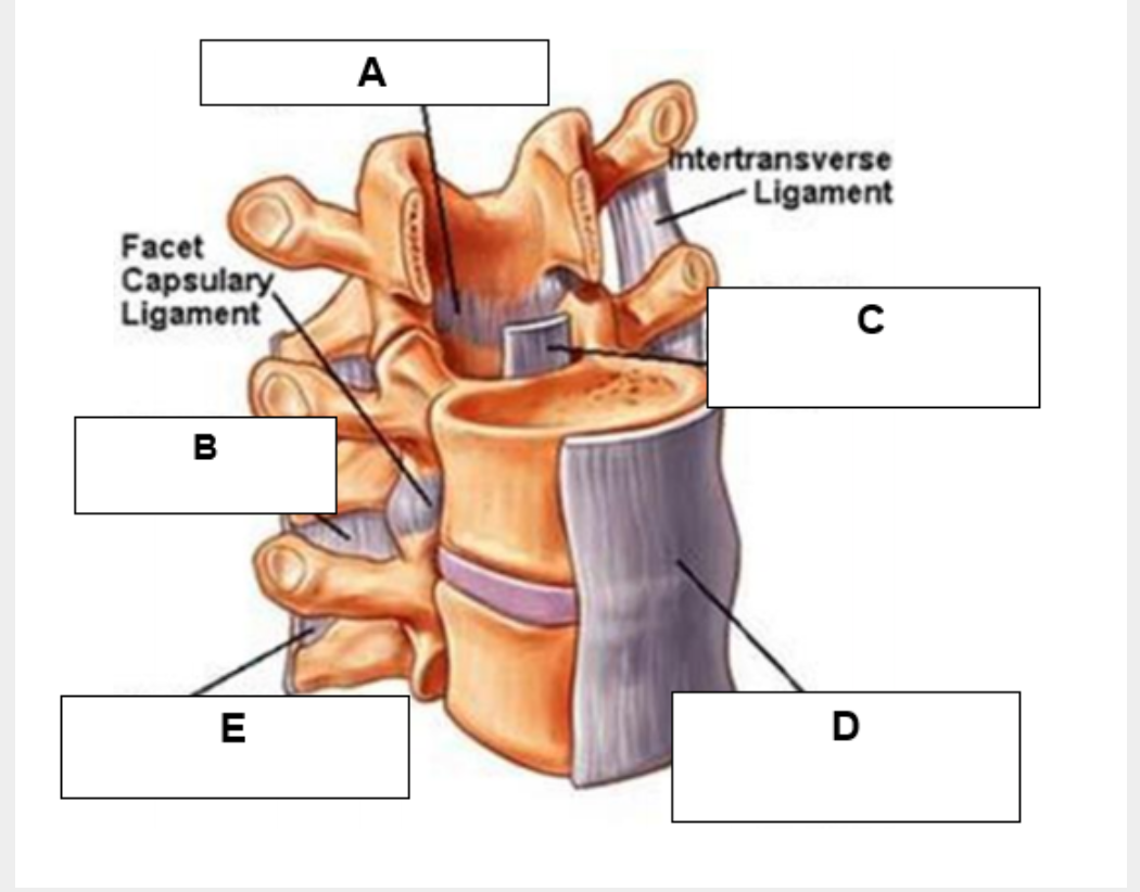 CORRECT – C refers to the posterior longitudinal ligament. The posterior longitudinal ligament runs posterior to the vertebral bodies, from the body of the axis (C2 vertebra) to the sacral canal. Superior to the axis, it continues as the tectorial membrane of the atlanto-axial joint (a strong band which covers the dens of the axis). It prevents hyperflexion of the vertebral column. Its main relevance clinically is that it reinforces the annulus fibrosus centrally so that intervertebral disc prolapse tends to occur lateral to the posterior longitudinal ligament. This type of prolapse is called a paracentral disc prolapse. As one flexes their spine, the posterior longitudinal ligament, ligamentum flavum, interspinous ligament and supraspinous ligament are all under tension. The vertebral bodies, intervertebral discs and anterior longitudinal ligament are under compression.