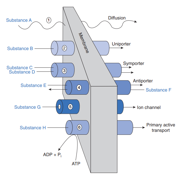 List 6 mechanism of cellular transmembrane transport