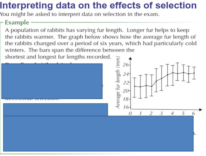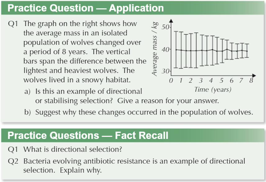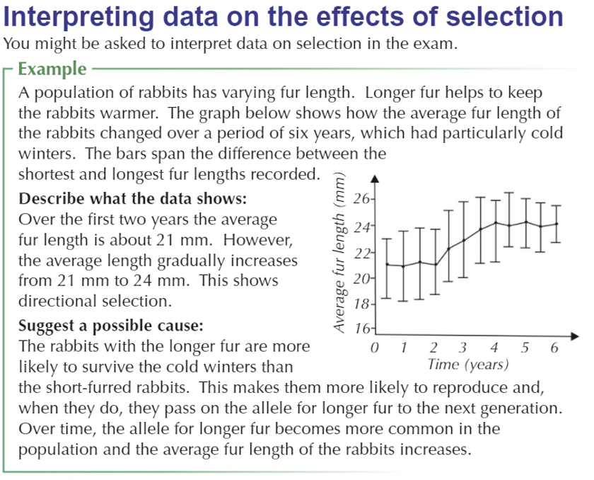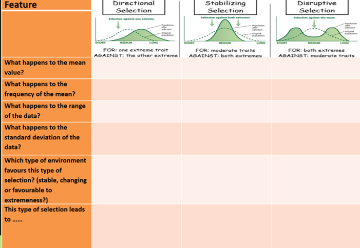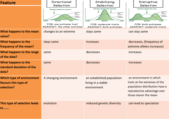 Individuals with alleles for extreme characteristics are selected for – are more likely to survive, reproduce and pass on their beneficial alleles. They have increased reproductive success. The allele may become beneficial in response to an environmental change. The population of individual show a similar range of alleles, with similar frequencies – just different alleles & mean, the standard deviation (the measure of the spread of data about the mean) will be similar. This type of selection leads to evolution