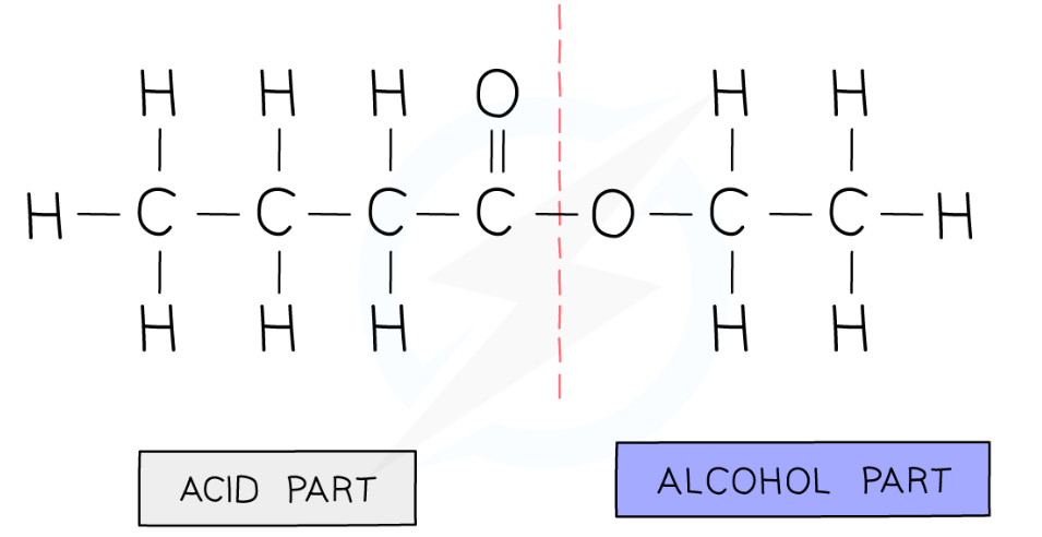 E.g. The ester formed from pentanol and butanoic acid is called pentyl butanoate